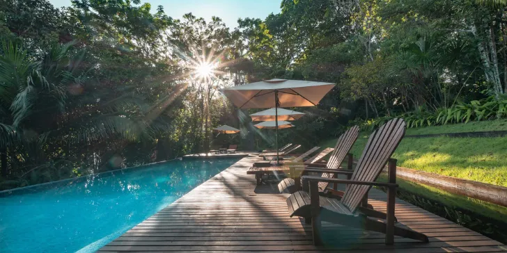 Embarque em voadeiras, como são chamadas as lanchas rápidas que fazem deslocamentos no rio, para um passeio no Parque Nacional de Anavilhanas. A depender da estação, o cenário é completamente diferente! Os hóspedes podem aproveitar as belas praias de areia clara e águas escuras na época da seca ou a magia dos igapós, na época da cheia, quando a floresta fica alagada e a trilha é feita entre as copas das árvores.